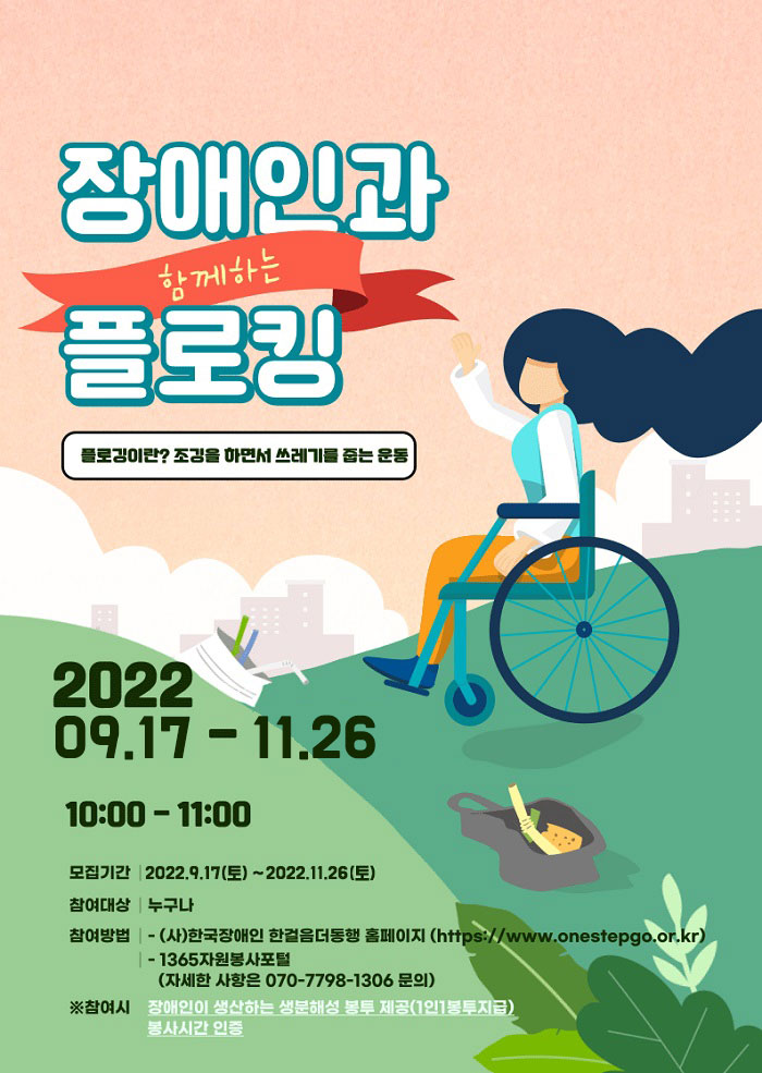 한국장애인 한걸음 더 동행에서는 코로나로 인해서 집에서만 활동하는 사람과 함께 많은 사람이 밀접하지 않은 곳으로 가서 쓰레기 주으며, 스쿼트 동작, 일상 생활운동을 할 수 있는 플로킹을 함께 하고 있습니다.